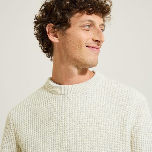 Ce pull à la texture gaufrée se marie parfaitement avec un jean brut pour un look décontracté. Pour une allure plus habillée, on peut l’associer à un pantalon chino et des derbies.